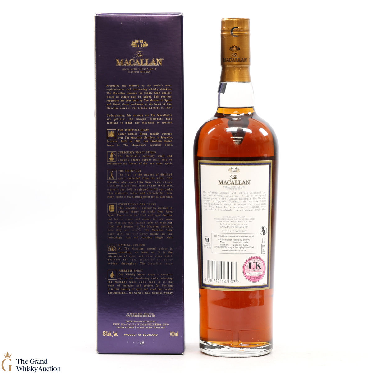 This annual release of The Macallan's popular 18 Year Old Sherry Oak is matured exclusively in sherry seasoned casks, built from both Spanish and American oak, providing a beautifully dark flavour with rich aromas.
