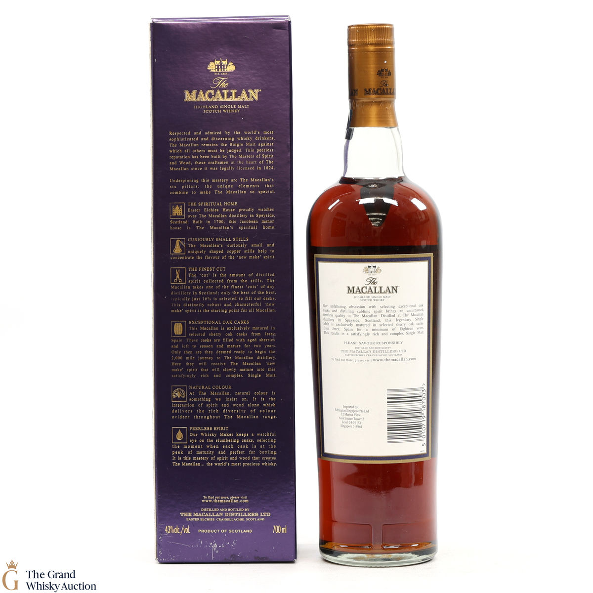This Macallan 18 Year Old Single malt was bottled in 2016 in Speyside Scotland. This classic was one of the last bottles in this shape. It is now becoming rarer and a staple item in a collector's cellar!