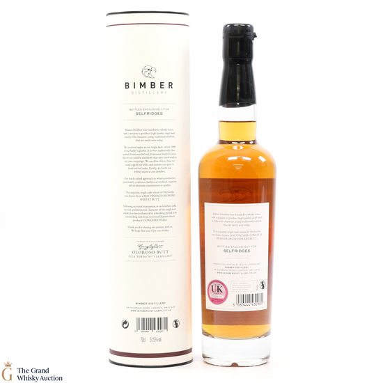 An exclusive partnership between the London distillery and department store Selfridges. This Bimber was made from single farm barley (which was malted at Westminster Maltings) and matured in four 1st fill American Oak Ex-bourbon casks. It was then finished in a single Oloroso sherry butt from hugely renowned Spanish sherry producer González Byass. Bottled in June 2020 at 51.5% ABV.