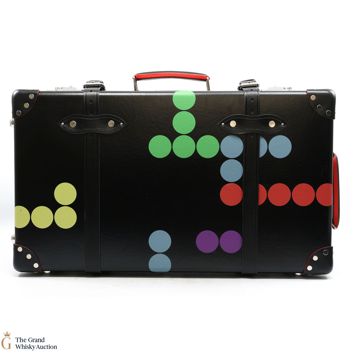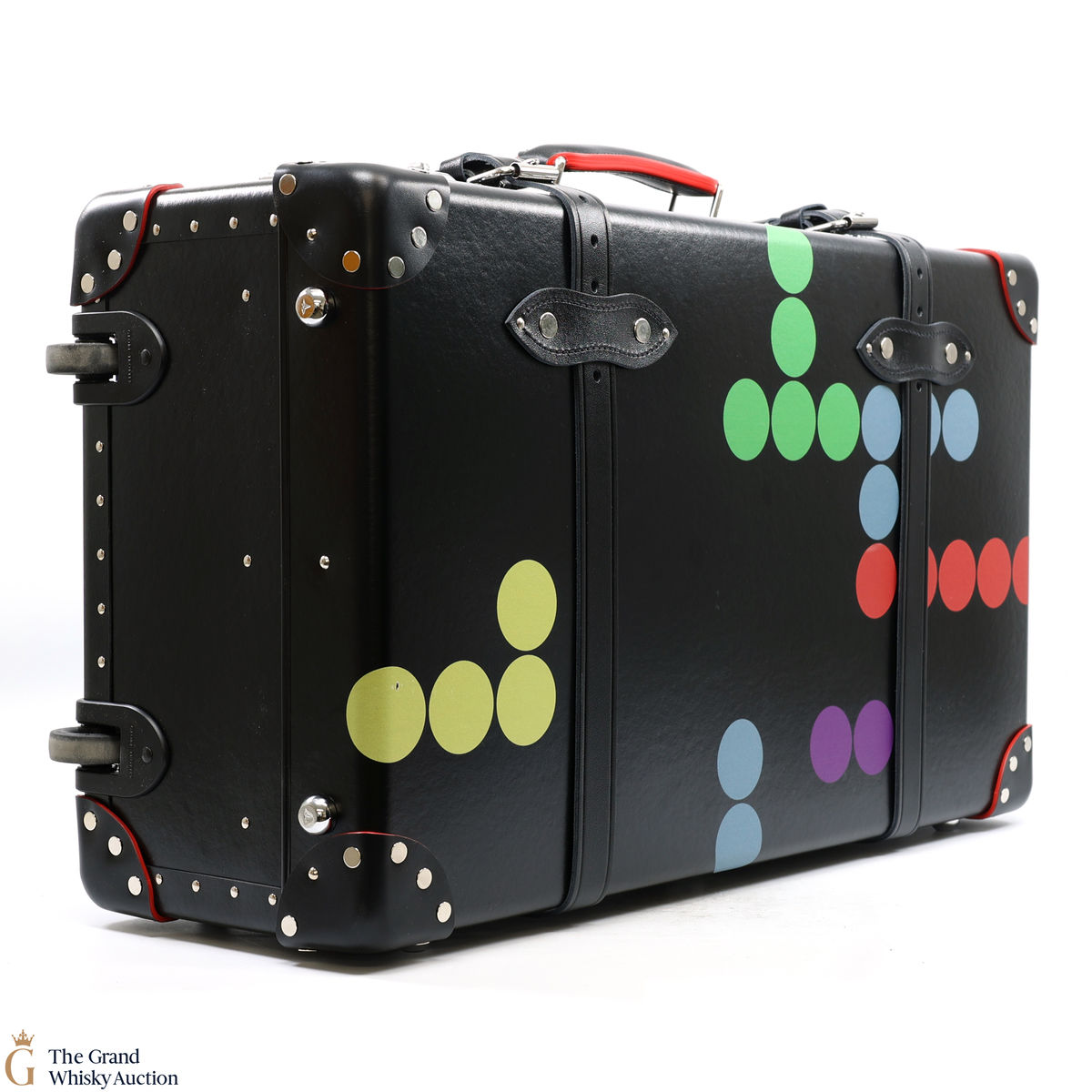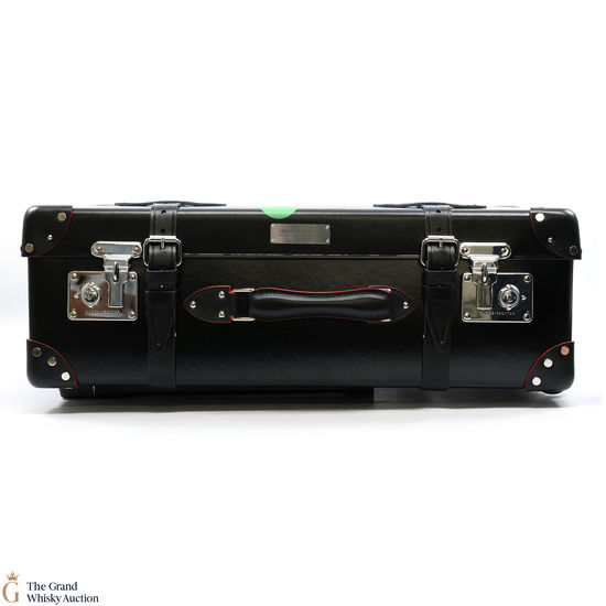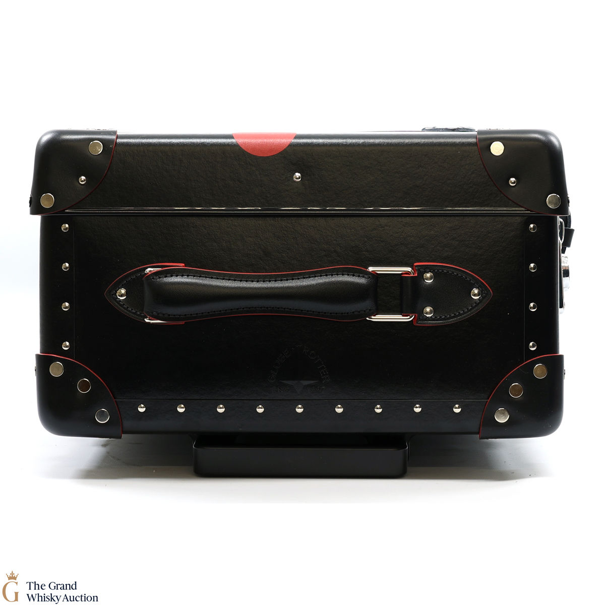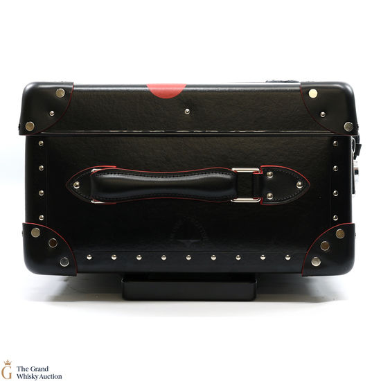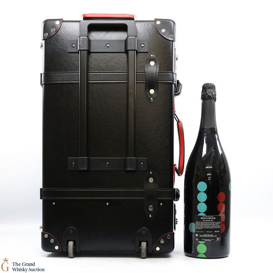 The bottle is presented in a bespoke Globe-Trotter 26” 2-wheel trolley case, handmade by the British luggage makers' in their signature patented vulcanised fibreboard and leather. Lined in a bright red, the case has a special edition Bollinger and 007 plaque inside and out.