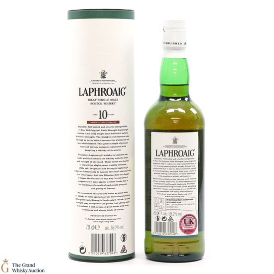 This original cask strength bottling of the medicinal 10 year old from Islay's bestselling distillery, Laphroaig. In making Laphroaig, malted barley is dried over a peat fire. The smoke from this peat, found only on Islay, gives Laphroaig its particularly rich flavour.