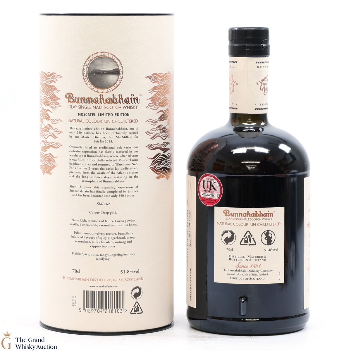 Originally filled to traditional oak casks this exclusive expression has slowly matured in the warehouse at Bunnahabhain, where, after 16 years it was filled into carefully selected Moscatel wine hogsheads casks and returned to Warehouse No8. For a further 2 years the casks lay undisturbed, protected from the wrath of Atlantic storms and the long summer days. After 18 years this stunning expression has finally completed its journey and was decanted into only 250 bottles.