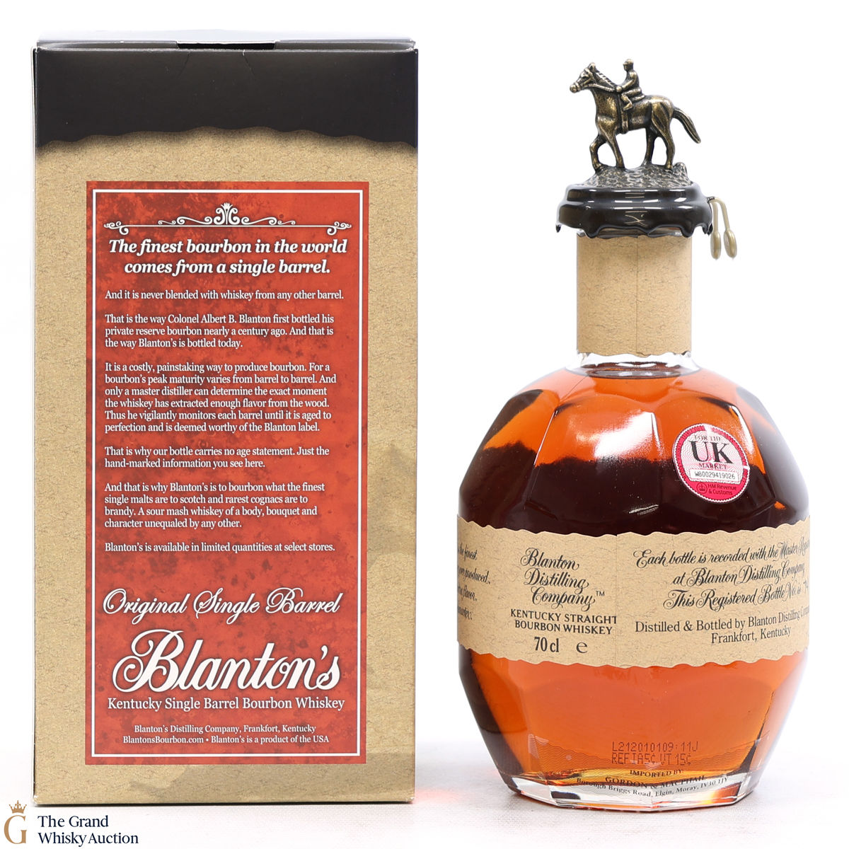 PLEASE NOTE: The wax seal on Blanton's bottles are prone to cracking in transit due to their design. Therefore, as stated in our T&C’s, we do not and will not accept liability should the seal be breached, broken, split or leak in transit. Additionally, please know due to the design of the internal cardboard packaging that surrounds the top of the bottles, it too may be torn. By bidding on this lot you have understood this to be true. Insurance is for complete breakage or loss in transit only.