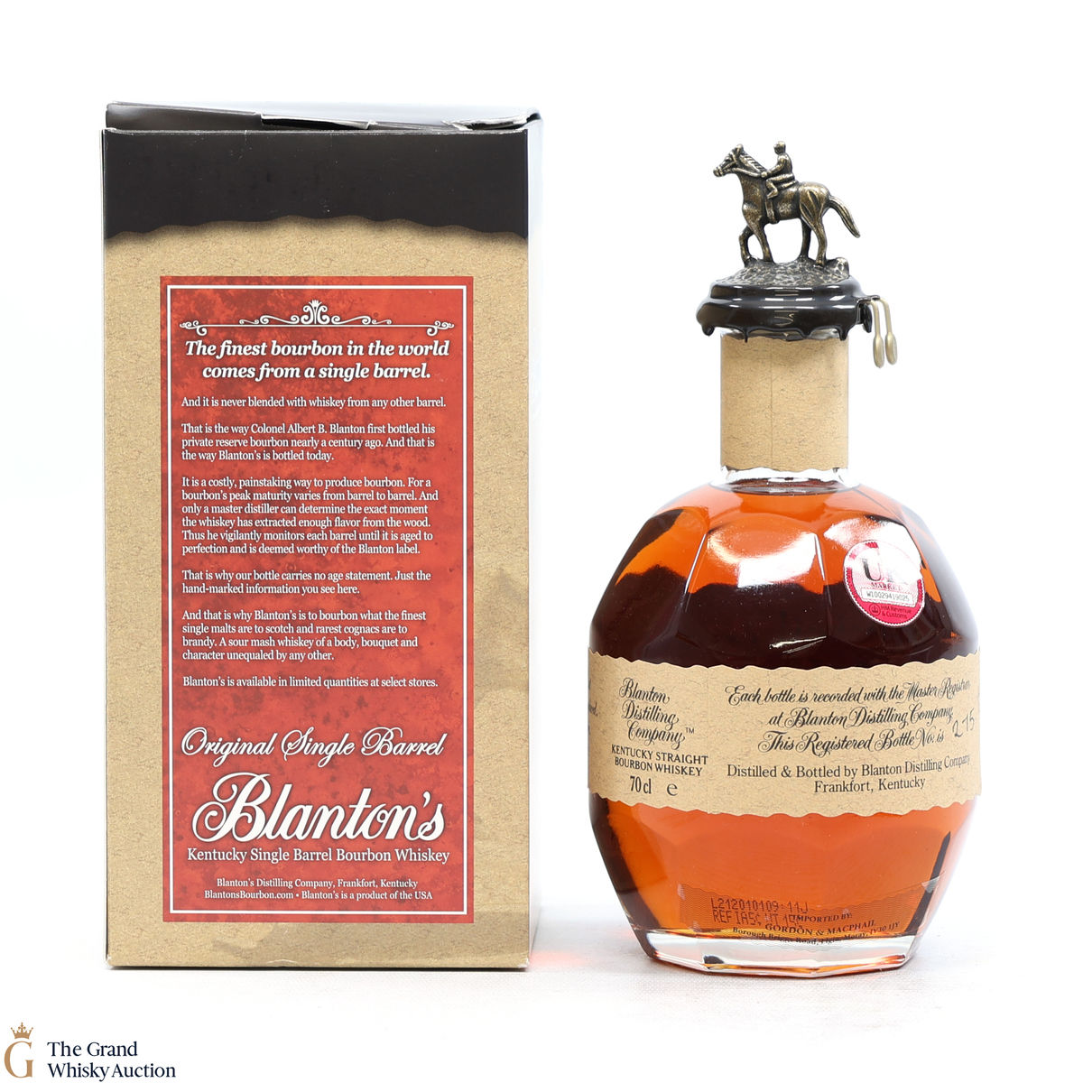 PLEASE NOTE: The wax seal on Blanton's bottles are prone to cracking in transit due to their design. Therefore, as stated in our T&C’s, we do not and will not accept liability should the seal be breached, broken, split or leak in transit. Additionally, please know due to the design of the internal cardboard packaging that surrounds the top of the bottles, it too may be torn. By bidding on this lot you have understood this to be true. Insurance is for complete breakage or loss in transit only.