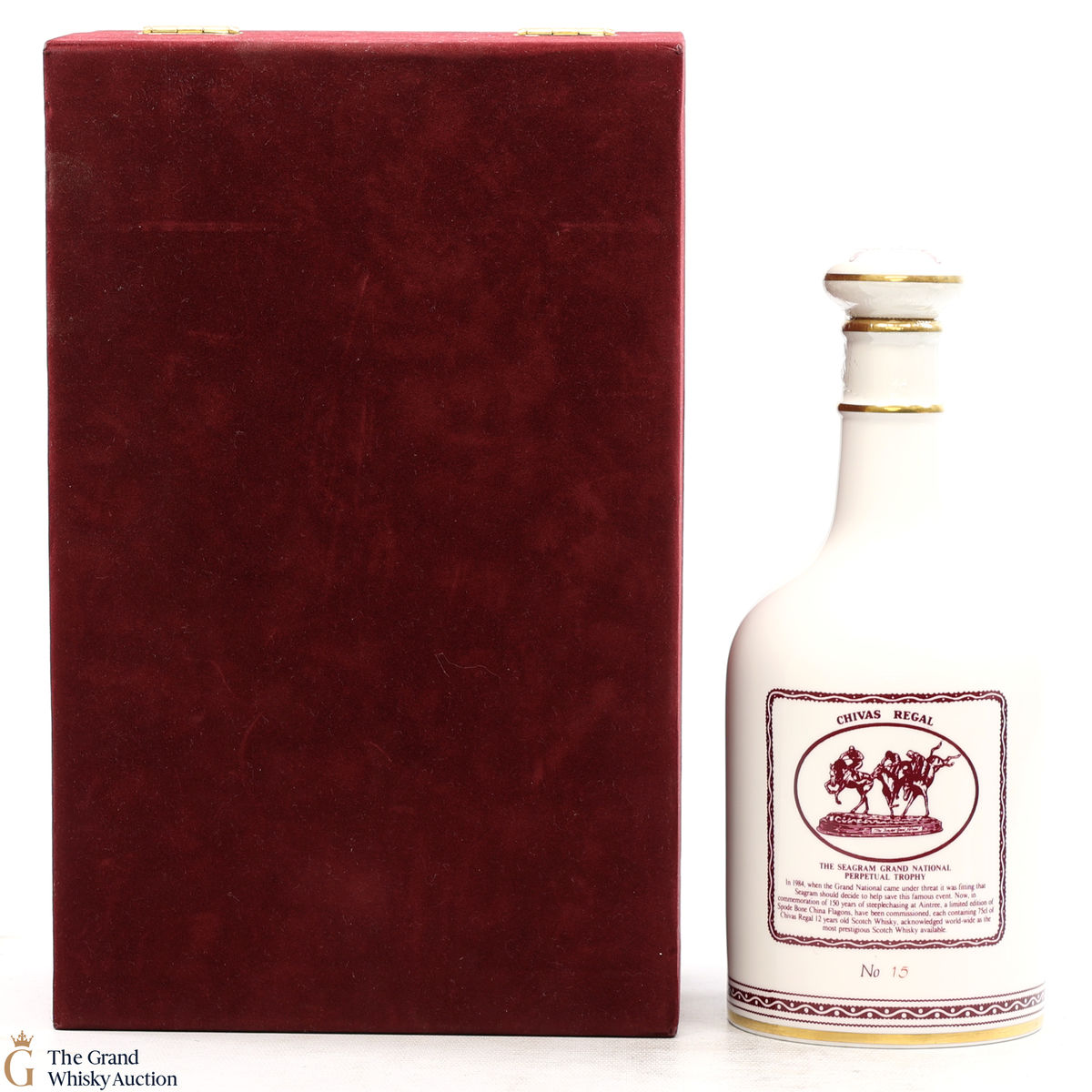 This is the Grand National Decanter, presented in a bone-china Spode decanter. Released to commemorate 150 years of steeplechasing at Aintree, the home of the Grand National.