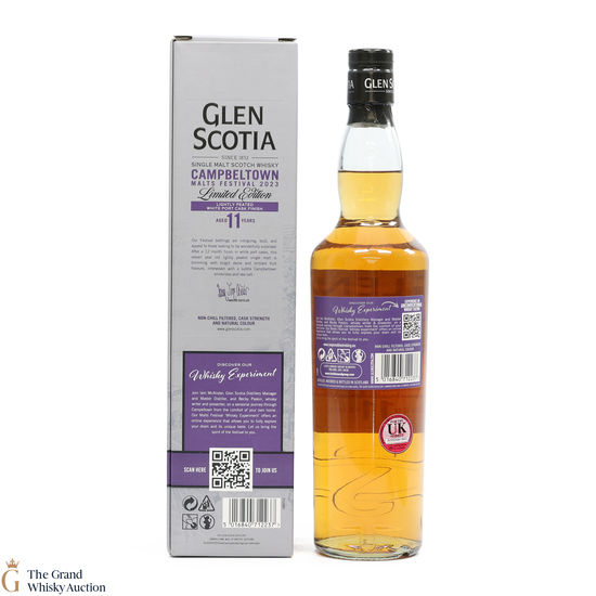 This limited edition from Glen Scotia was released for the 2023 Campbeltown Malts Festival. This single malt is lightly peated and was finished in a white port cask.