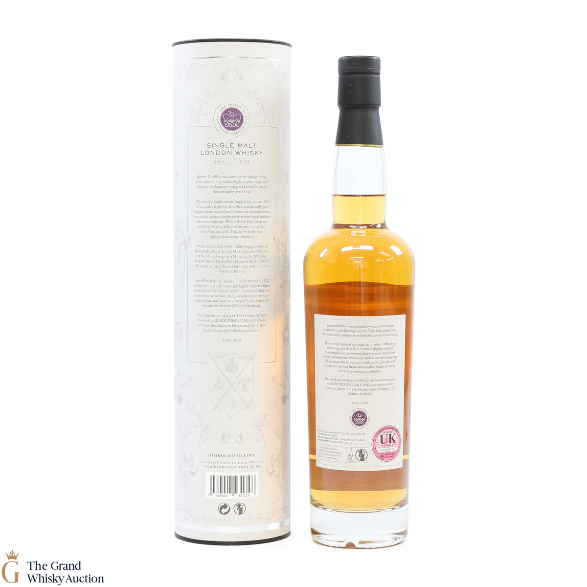 This Bimber limited edition small batch release celebrates the Platinum Jubilee of Queen Elizabeth II. Matured in ex-bourbon casks for four years before being bottled at a strength of 51.8% abv. One of 1,952 bottles.