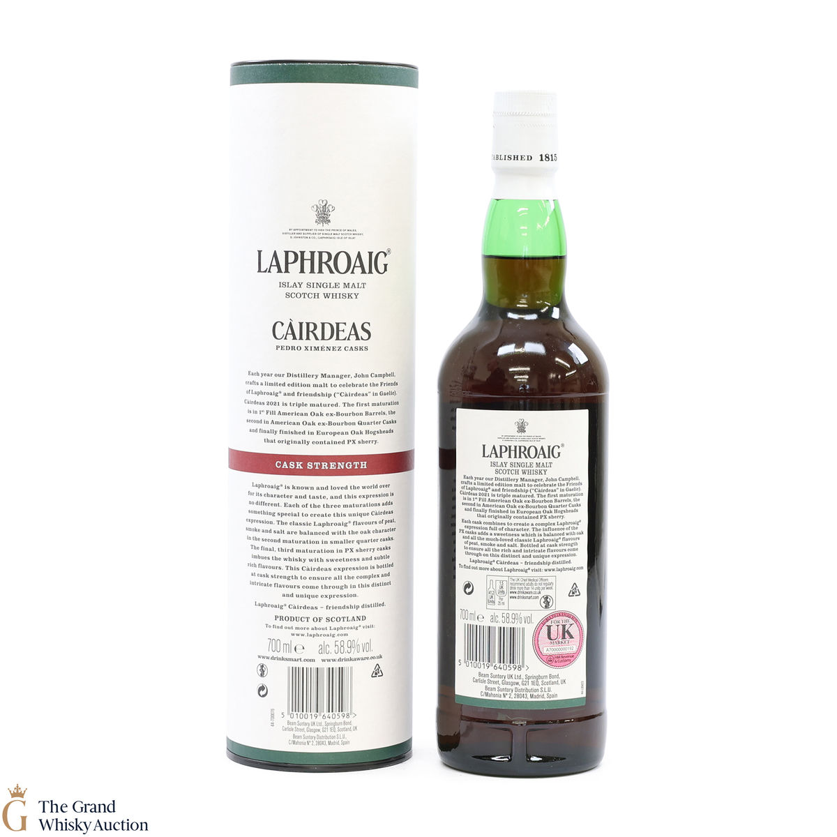 The 2021 edition of Laphroaigs Cairdeas series was first matured in a 1st fill American oak ex-bourbon barrel, then in an American oak ex-bourbon quarter cask before finally being finished in European PX sherry casks. Bottled at the cask strength of 58.9% ABV in 2021 to celebrate the Friends of Laphroaig.