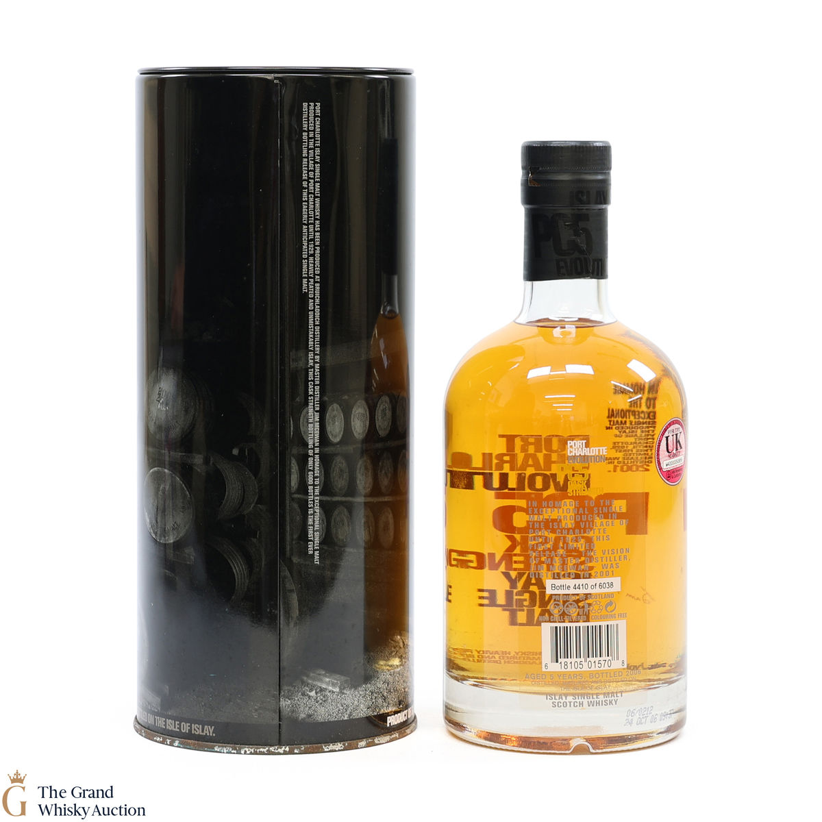 Port Charlotte PC5, produced by Bruichladdich Distillery, is a heavily peated spirit. It was the first release of heavily peated Port Charlotte and was produced in 2001 from some of the first spirits to be produced after the distillery's reopening. The single malt was bottled at 5 years old in 2006 and was limited to 6038 bottles.