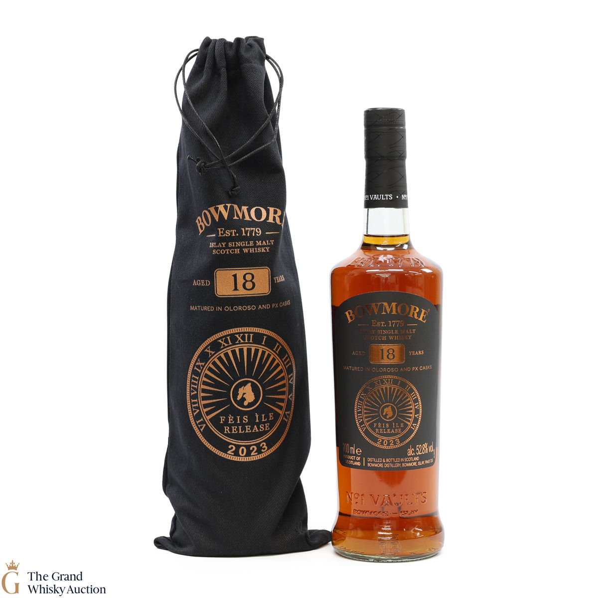 This is the Feis Ile 2023 release from Bowmore Distillery. Matured in Oloroso & PX casks for 18 years, this single malt was bottled at 52.8% ABV. This rare annual release from Bowmore is limited to just 3500 bottles.