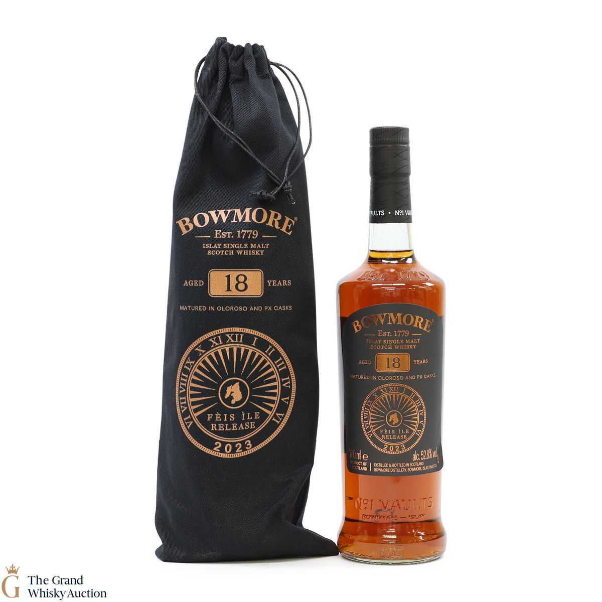 This is the Feis Ile 2023 release from Bowmore Distillery. Matured in Oloroso & PX casks for 18 years, this single malt was bottled at 52.8% ABV. This rare annual release from Bowmore is limited to just 3500 bottles.