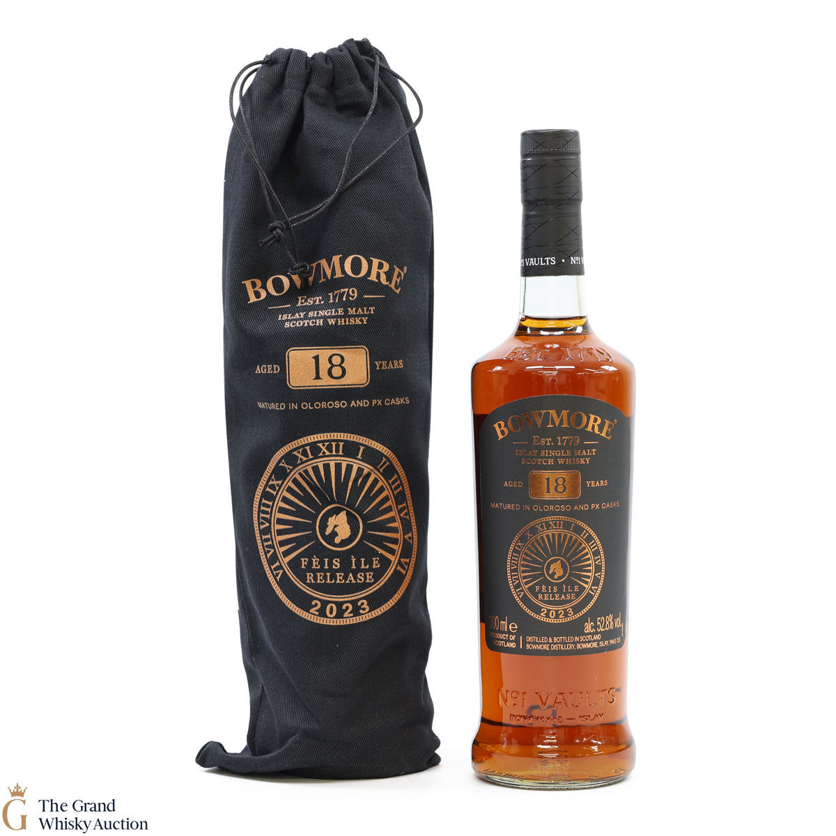 This is the Feis Ile 2023 release from Bowmore Distillery. Matured in Oloroso & PX casks for 18 years, this single malt was bottled at 52.8% ABV. This rare annual release from Bowmore is limited to just 3500 bottles.