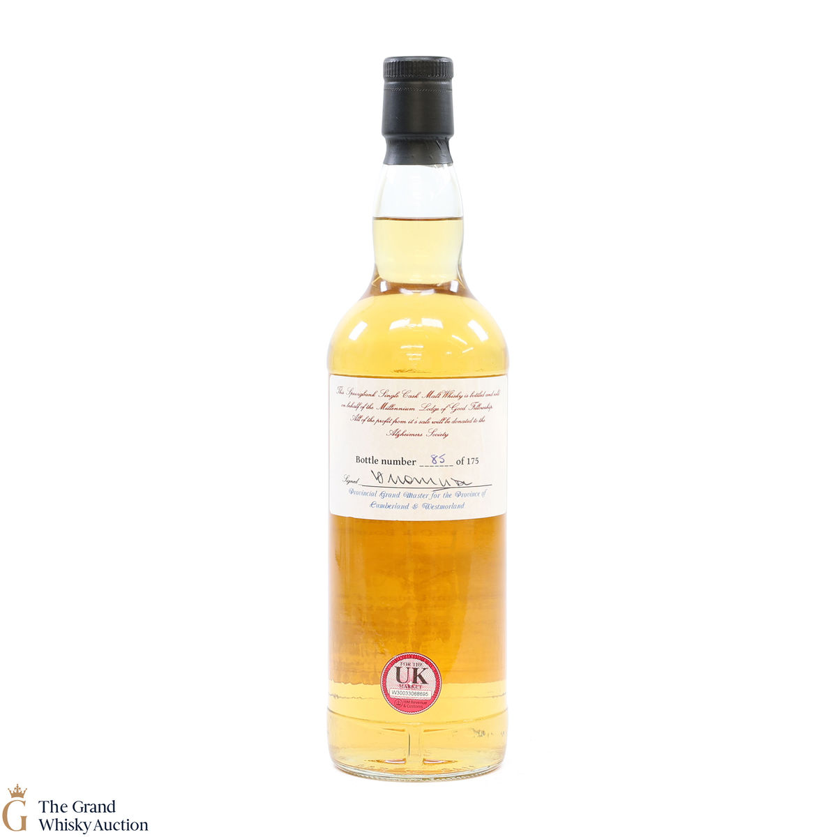 This single malt was matured in Oak Bourbon Cask #303 from 1999 to 2017 before being bottled for Millennium Lodge of Good Fellowship No. 9710 Province of Cumberland and Westmorland.