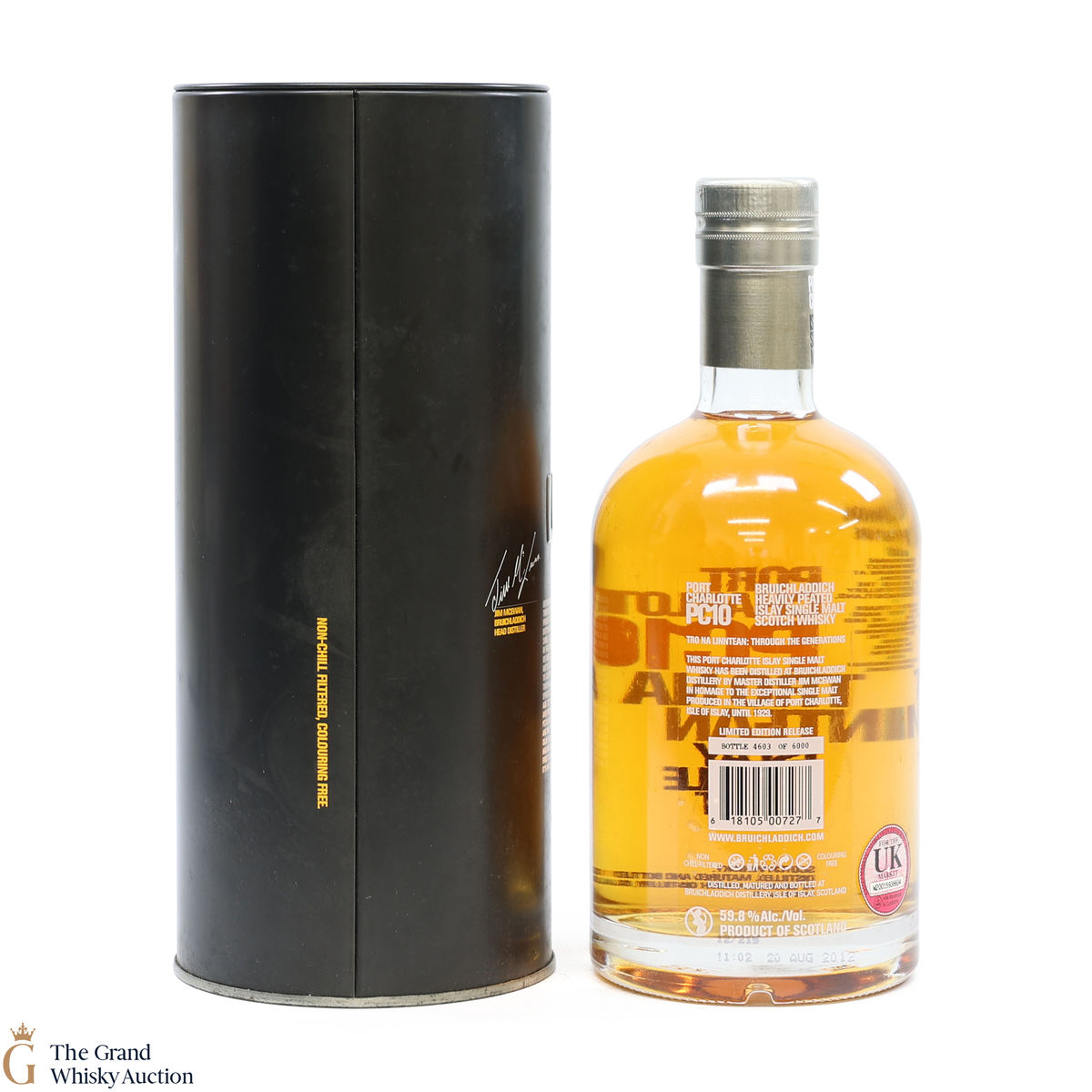 Port Charlotte PC10, produced by Bruichladdich Distillery, is a heavily peated spirit. It was the first release of heavily peated Port Charlotte and was produced in 2001 from some of the first spirits to be produced after the distillery's reopening. The single malt was bottled at 10 years old and was limited to 6000 bottles.