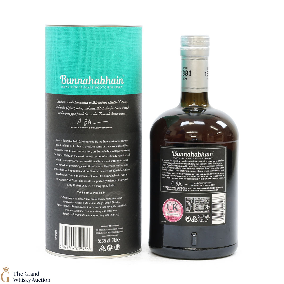 This Bunnahabhain limited release was distilled in 2007 and was aged in Warehouse 8 for 11 years. Initially matured in whisky refill hogshead casks and then filled into port pipes in 2016 for a final 2 years of maturation. It was bottled at 55.3% ABV. This is one of 1578 bottles produced.