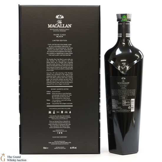 The Macallan Rare Cask Black Limited Edition was released to celebrate the opening of the new Macallan Distillery. It is part of the Macallan 1824 series and features stunning photography by Paolo Pellegrin and a bespoke flask from the Distillery Visitor Centre. The release was a limited edition of 7000 sets, which were only available at airports.