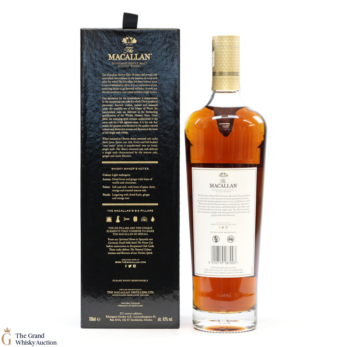 This annual release of The Macallan's popular 18 Year Old Sherry Oak is matured exclusively in sherry-seasoned casks, built from both Spanish and American oak, providing a beautifully dark flavour with rich aromas.
