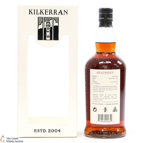 A single cask Kilkerran matured for 10 years in a fresh port pipe then a further 5 years in a refill bourbon hogshead. Specially bottled for Lago Imports, Denmark, to celebrate the 15th anniversary of the opening of Glengyle Distillery 2004.