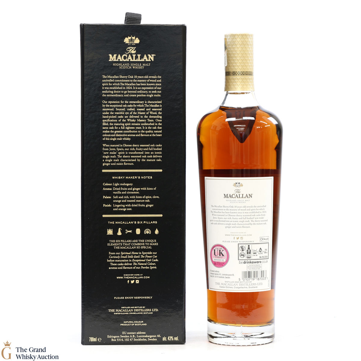 This annual release of The Macallan's popular 18 Year Old Sherry Oak is matured exclusively in sherry seasoned casks, built from both Spanish and American oak, providing a beautifully dark flavour with rich aromas.