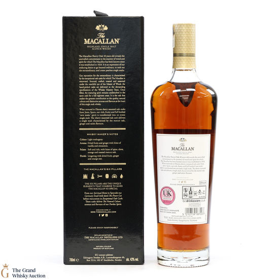 This annual release of The Macallan's popular 18 Year Old Sherry Oak is matured exclusively in sherry seasoned casks, built from both Spanish and American oak, providing a beautifully dark flavour with rich aromas.
