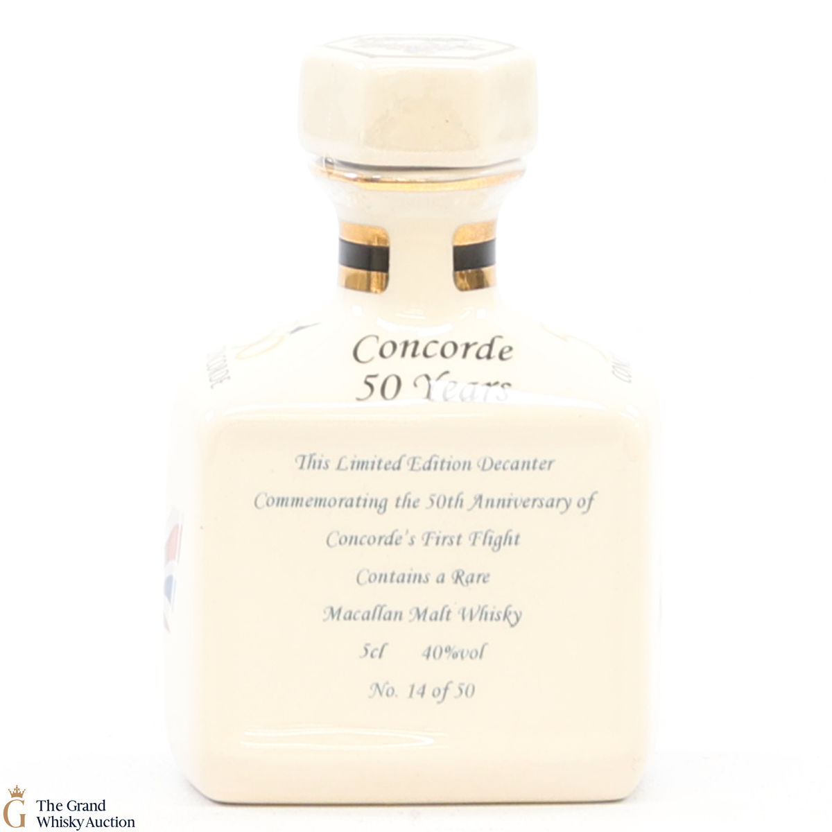 A mini decanter commemorating the 50th anniversary of Concorde's First Flight. Filled with Macallan, this is one of 50 bottles released.