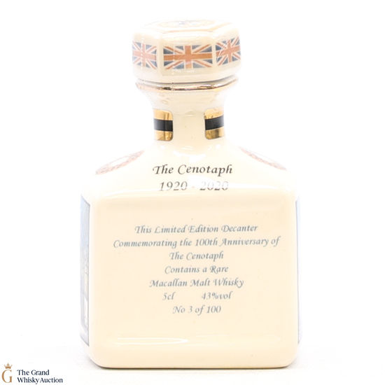 A mini decanter commemorating the 100th anniversary of The Cenotaph, 1920-2020. Filled with Macallan, this is one of 100 bottles released.