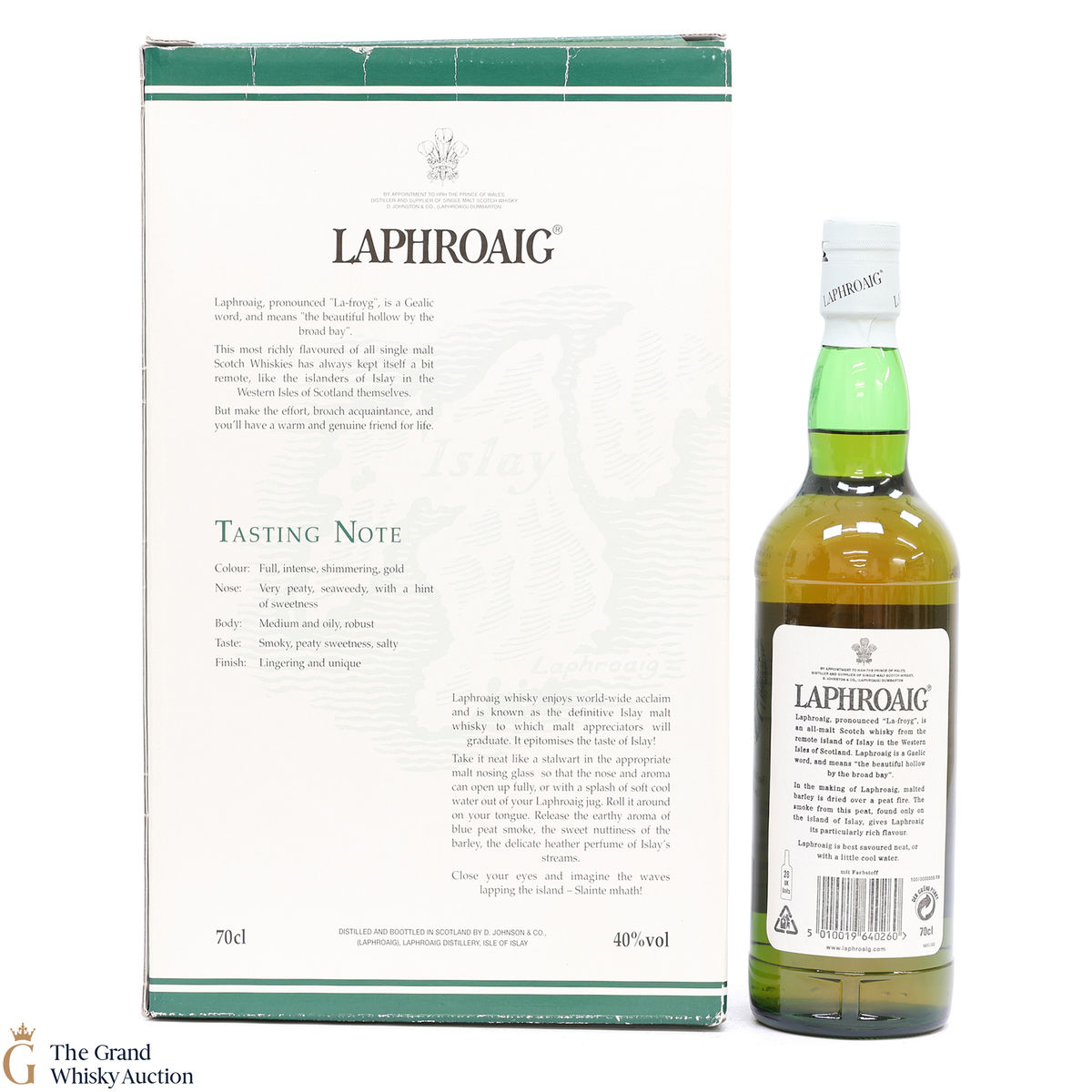 A 70cl of the medicinal 10-year-old from Islay's bestselling distillery, Laphroaig. In making Laphroaig, malted barley is dried over a peat fire. The smoke from this peat, found only on Islay, gives Laphroaig its particularly rich flavour.