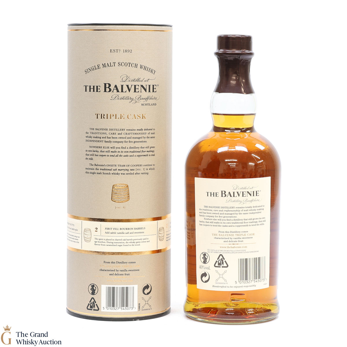 The Balvenie Triple Cask is a single malt Scotch whisky from this renowned Speyside-based distillery. Matured in American oak barrels, traditional refill casks and first-fill Oloroso sherry butts, this single malt has a complex taste yet brings a great balance of fruit and vanilla.