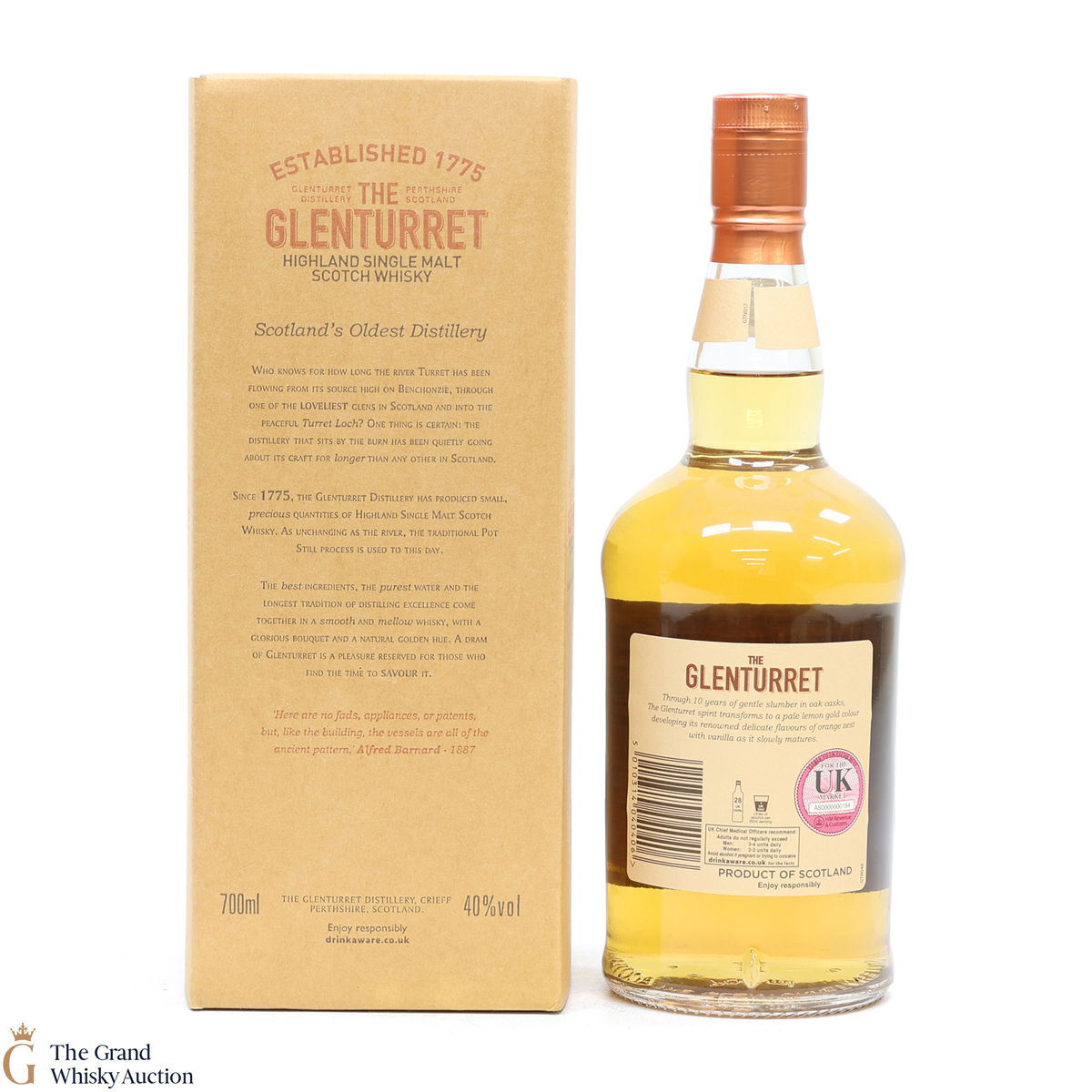 Due to the various ages of bottles and their seals, the condition of liquid is at the buyer's discretion and no claim can be lodged against failure/leakage in transit. Loss and breakage cover is available at 3% of the hammer price as standard. If the lot is not insured, no claim can be lodged against the courier or The Grand Whisky Auction for breakage or loss in transit.