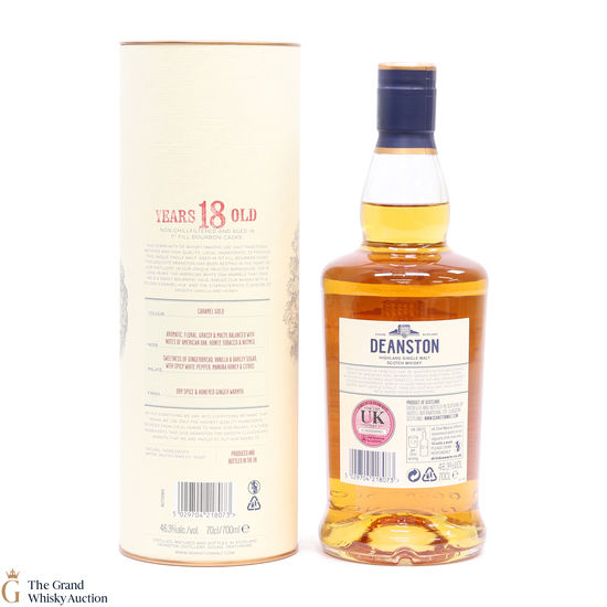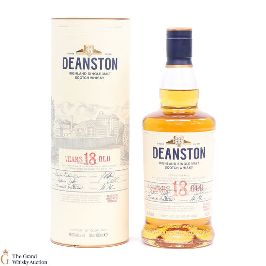 Deanston 18 Year Old – finished in first-fill bourbon barrels. True to the Highland distillery's signature profile, sweet with hints of spice.