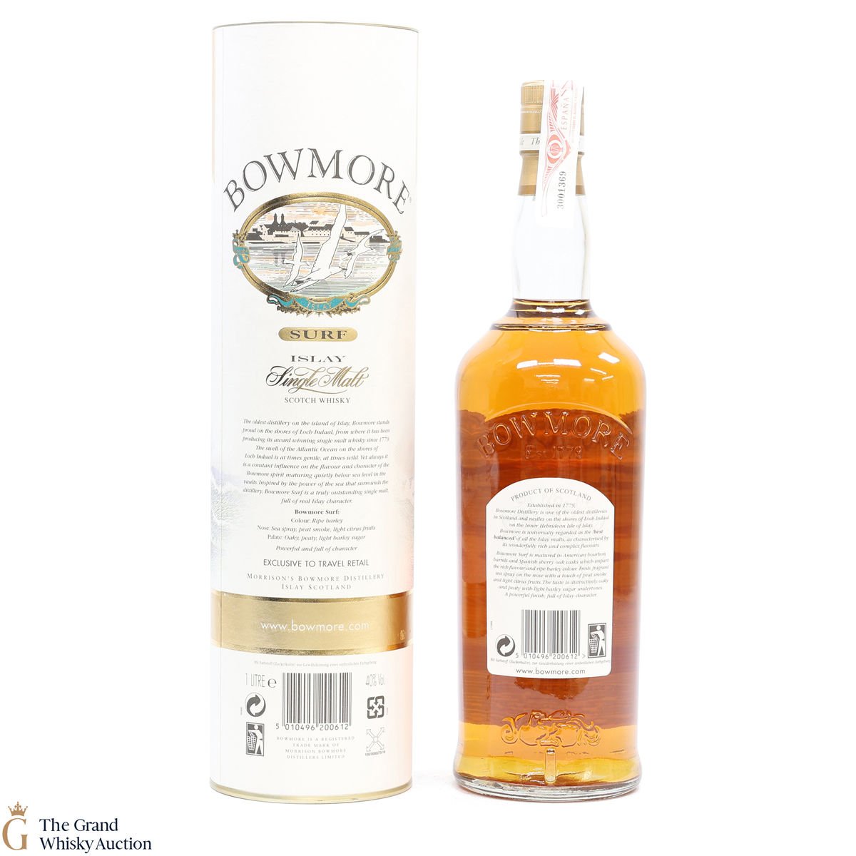 Bottles for the travel retail market, this Bowmore has a nose of sea spray and peat smoke. The Bowmore distillery is the oldest established one on Islay. It was founded in 1779.