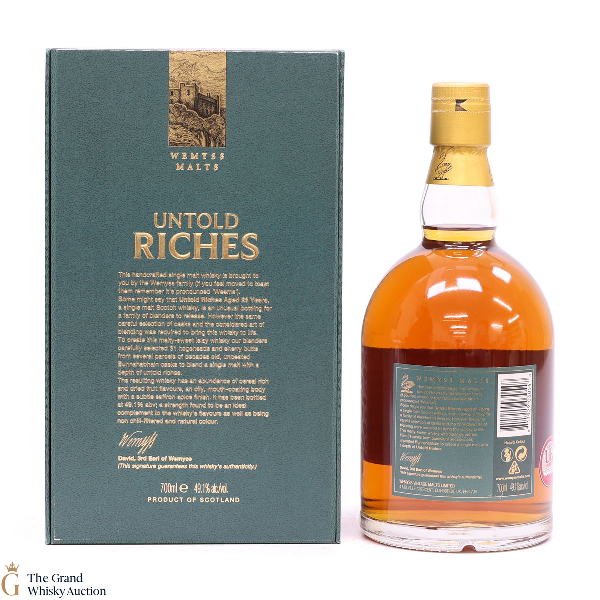This handcrafted single malt is brought to you by the Wemyss family. Distilled at Bunnahabhain distillery, the Untold Riches 28-Year-Old is a single malt held in hogsheads and sherry butts from several parcels of decades-old, unpeated Bunnahabhain casks.