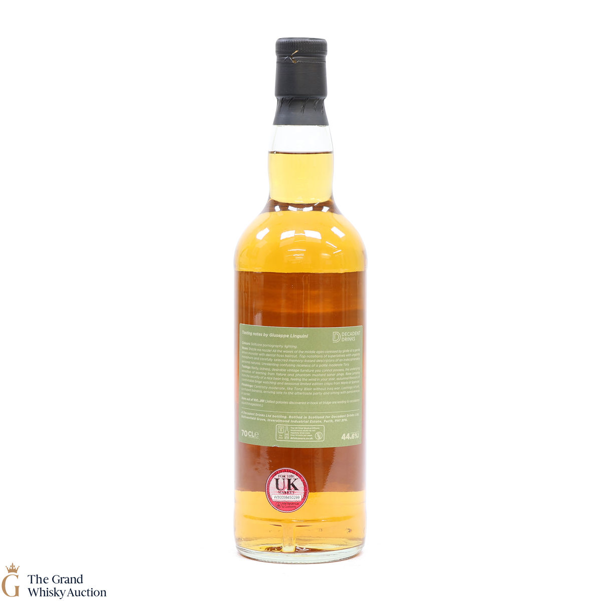 Due to the various ages of bottles and their seals, the condition of liquid is at the buyer's discretion and no claim can be lodged against failure/leakage in transit. Loss and breakage cover is available at 3% of the hammer price as standard. If the lot is not insured, no claim can be lodged against the courier or The Grand Whisky Auction for breakage or loss in transit.