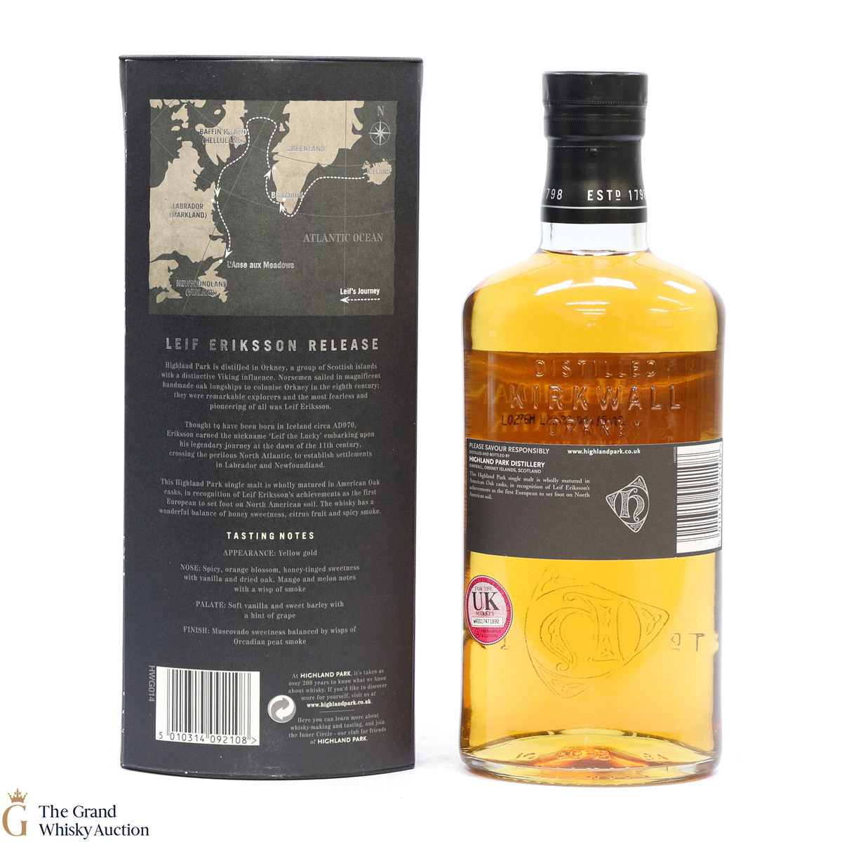 Launched in March 2010, for the travel retail market, Highland Park Leif Eriksson Limited Edition was released to celebrate the first European to reach America over a thousand years ago. The single malt was matured in American oak casks, both ex-bourbon and ex-sherry in recognition of Leif Eriksson, a pioneering Viking explorer, as the first European man to set foot on American soil.
