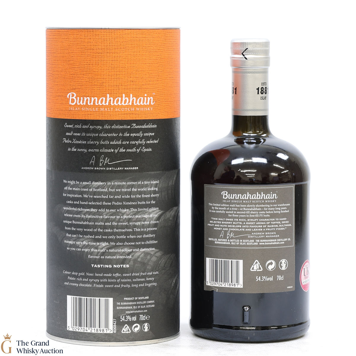 A limited-edition bottling from the Bunnahabhain distillery on the northeast coast of Islay. Distilled in 2003 and was initially aged in second-fill Sherry casks until 2011. At this point, the whisky was transferred over to yet more Sherry casks - first-fill Pedro Ximénez casks! It was bottled in 2017 at cask strength. This is one of 6768 individually numbered bottles.