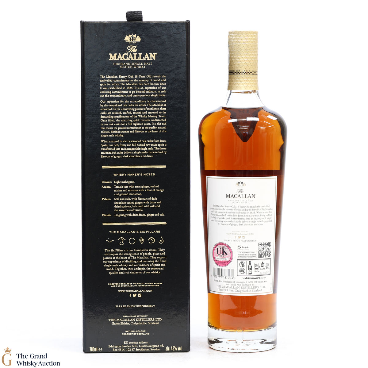 This annual release of The Macallan's popular 18 Year Old Sherry Oak is matured exclusively in sherry seasoned casks, built from both Spanish and American oak, providing a beautifully dark flavour with rich aromas.