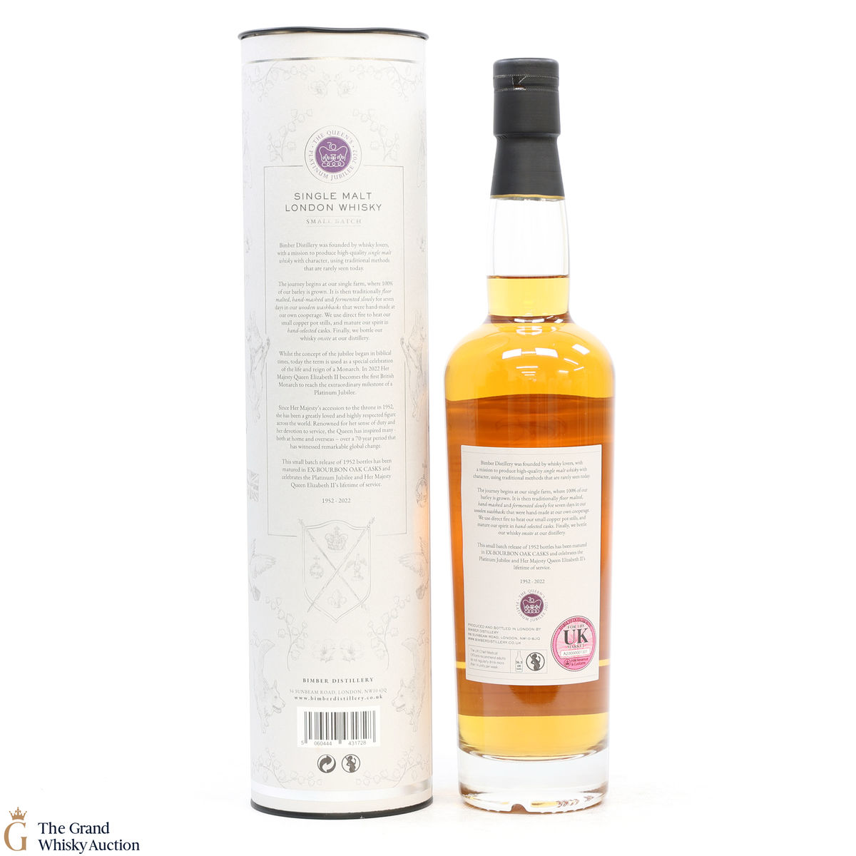 This Bimber limited edition small batch release celebrates the Platinum Jubilee of Queen Elizabeth II. Matured in ex-bourbon casks for four years before being bottled at a strength of 51.8% abv. One of 1,952 bottles.