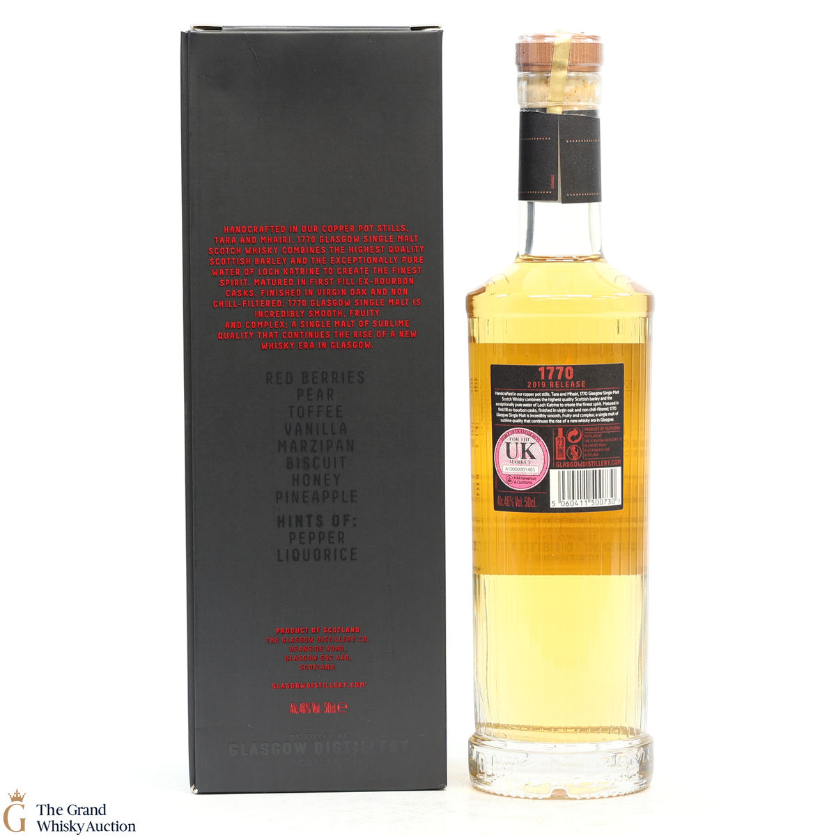 This is the 2019 release of 1770 Glasgow single malt from the Glasgow distillery, which brought whisky production back to the city for the first time in over 100 years. This limited-edition whisky was matured in first-fill bourbon casks and finished in virgin white oak.