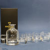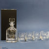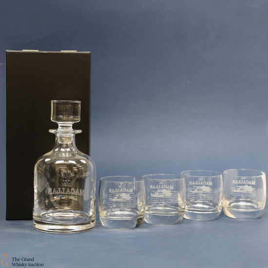 A glass decanter by Macallan, with a glass stopper. Along with 4 x glasses.