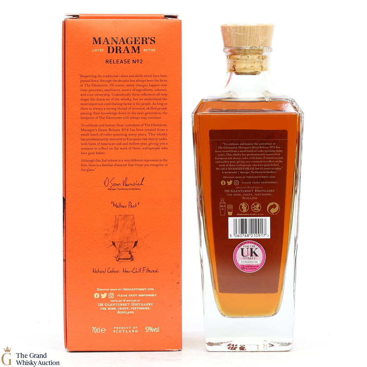 The Glenturret Manager's Dram - Release 2 described as mellow peat. Matured in European Sherry Driven in warehouse 9 before being bottled in 2022.