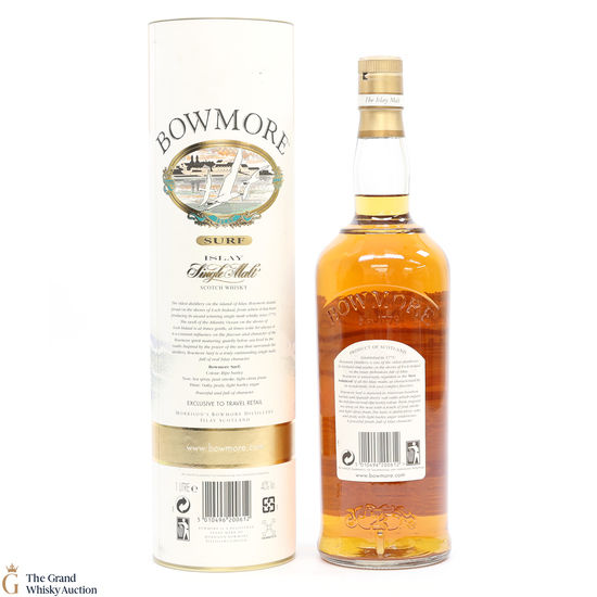 Bottles for the travel retail market, this Bowmore has a nose of sea spray and peat smoke. The Bowmore distillery is the oldest established one on Islay. It was founded in 1779.