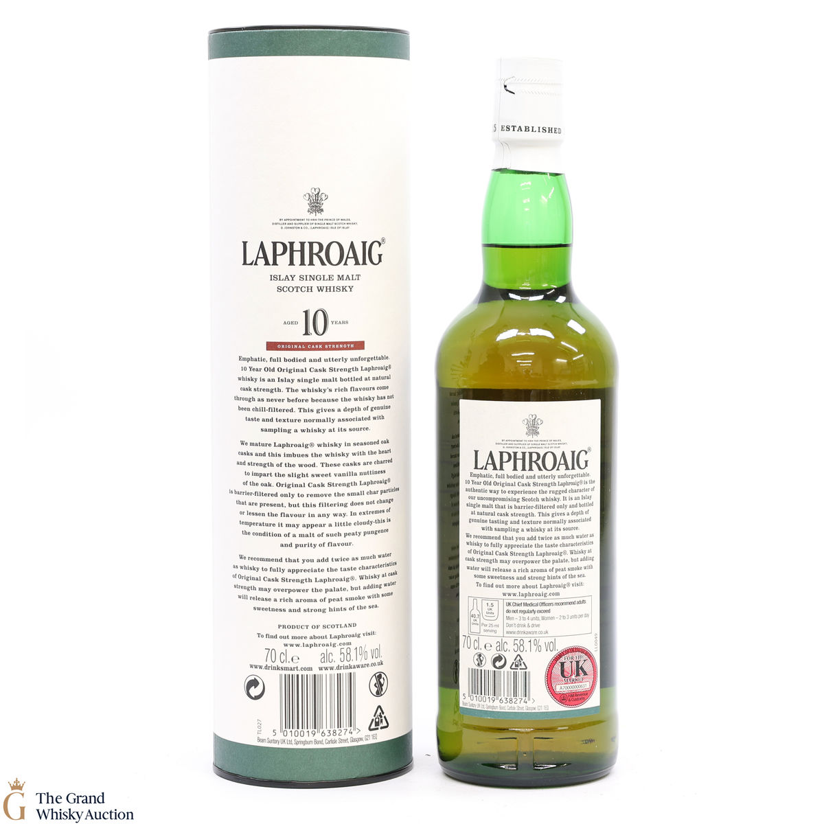 This bottling is from batch 009, original cask strength bottling of the medicinal 10-year-old from Islay's bestselling distillery, Laphroaig. In making Laphroaig, malted barley is dried over a peat fire. The smoke from this peat, found only on Islay, gives Laphroaig its particularly rich flavour. This release was bottled at 58.1% in February 2017.