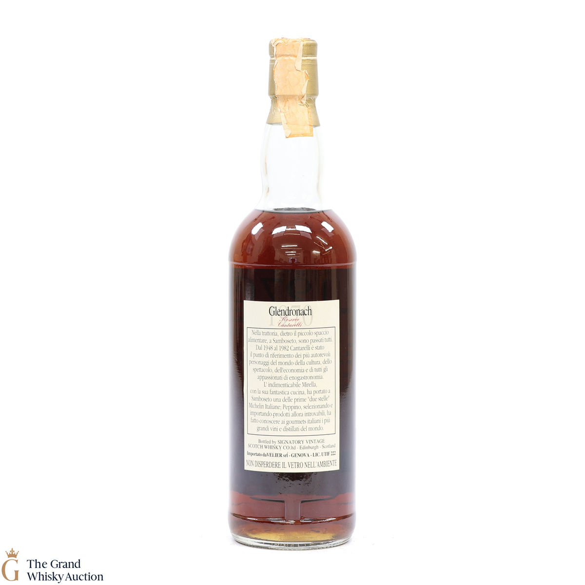 This single malt was distilled at the Glendronach Distillery in February 1970 and matured in sherry hogsheads #546-547 prior to being bottled in June 1992. This is one of only 1,200 bottles produced for Velier Reserve Cantarelli, the Italian wine and spirits importer. Bottled by Signatory Vintage.