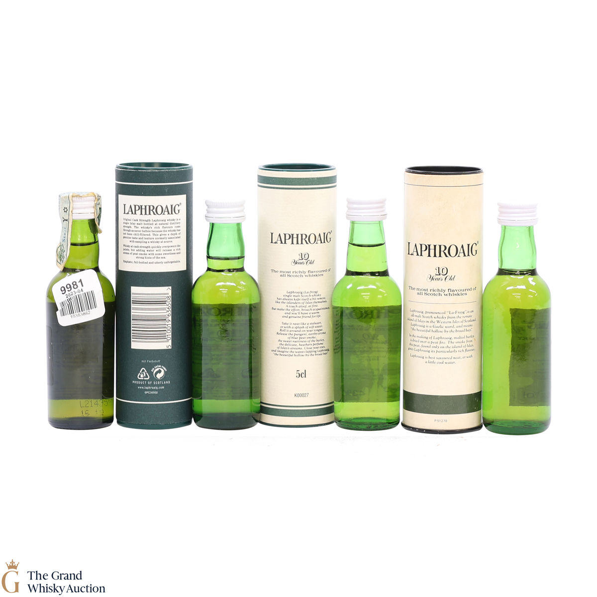 This lot includes three 5cl bottlings of the medicinal 10-year-old from Islay's bestselling distillery, Laphroaig. In making Laphroaig, malted barley is dried over a peat fire. The smoke from this peat, found only on Islay, gives Laphroaig its particularly rich flavour, two bottled at 43% ABV and one bottled at 40% ABV.