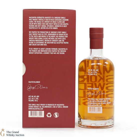 Skordetid is a Swedish single malt by Mackmyra which was partially finished in masi costaera amarone casks. Skordetid is Swedish for harvest time, this bottling is made from Mackmyra with the help from Italian wine producer Masi