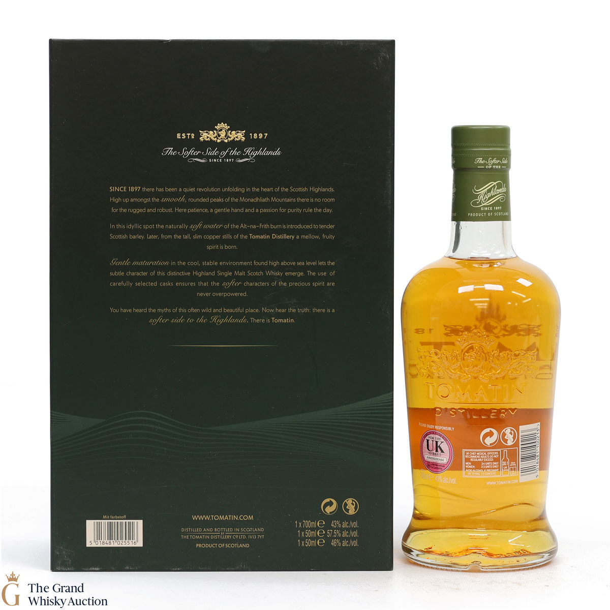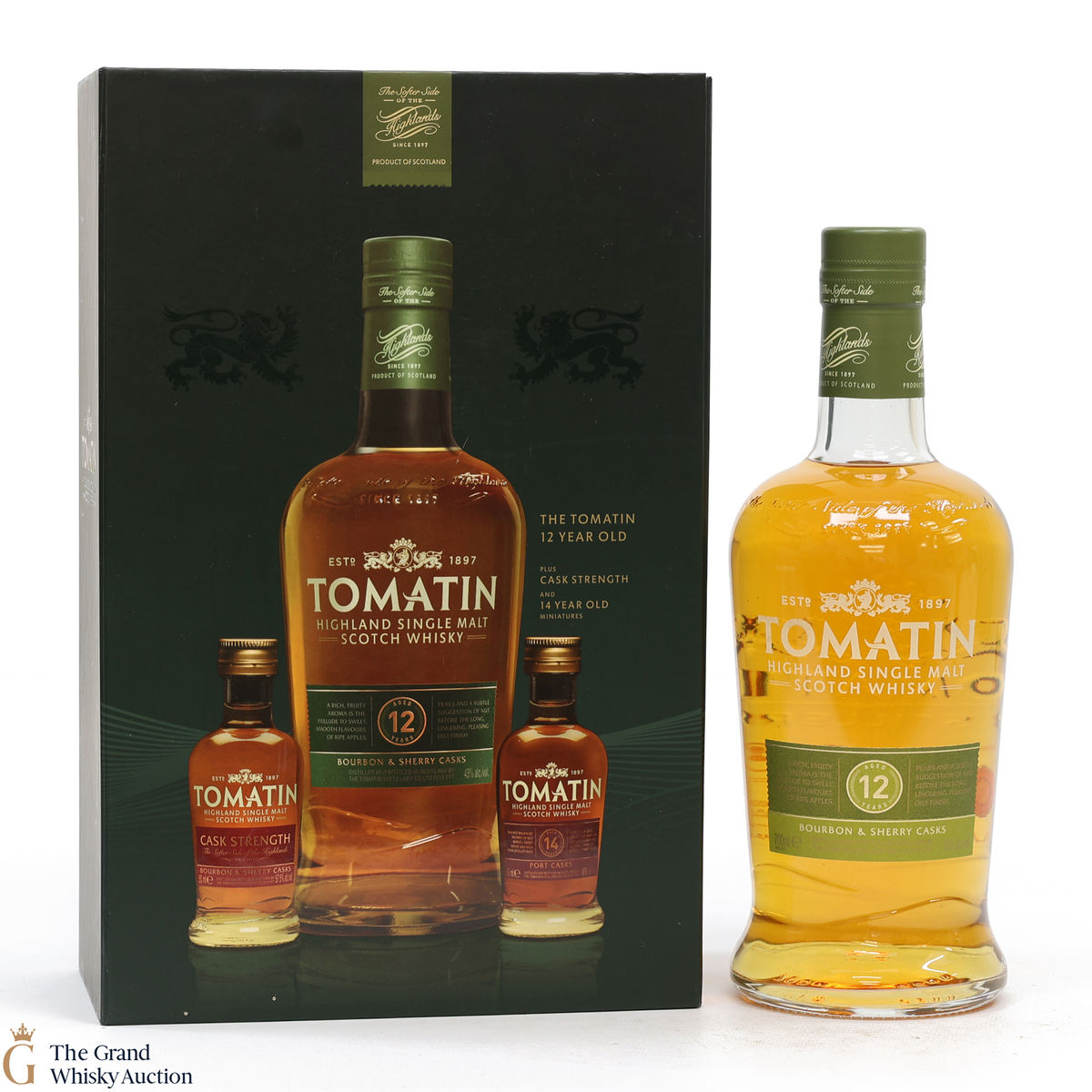 This gift set includes a 70cl bottling of Tomatin 12-Year-Old and two 5cl bottlings of Tomatin Cask Strength and Tomatin 14-Year-Old.