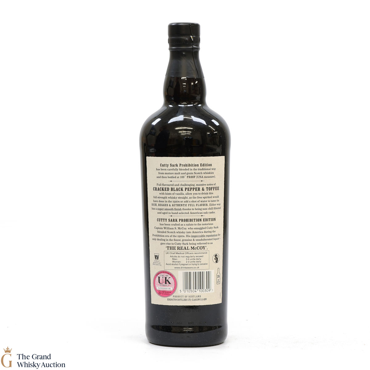 This small batch Prohibition edition of Cutty Sark has been crafted as a salute to the notorious Captain William S. McCoy, who smuggled Cutty Shark blended Scotch whisky into America during the Prohibition era of the 1920s. Bottled at 50% and housed in a black glass bottle with a cork seal, which was typical of bottles during the era.