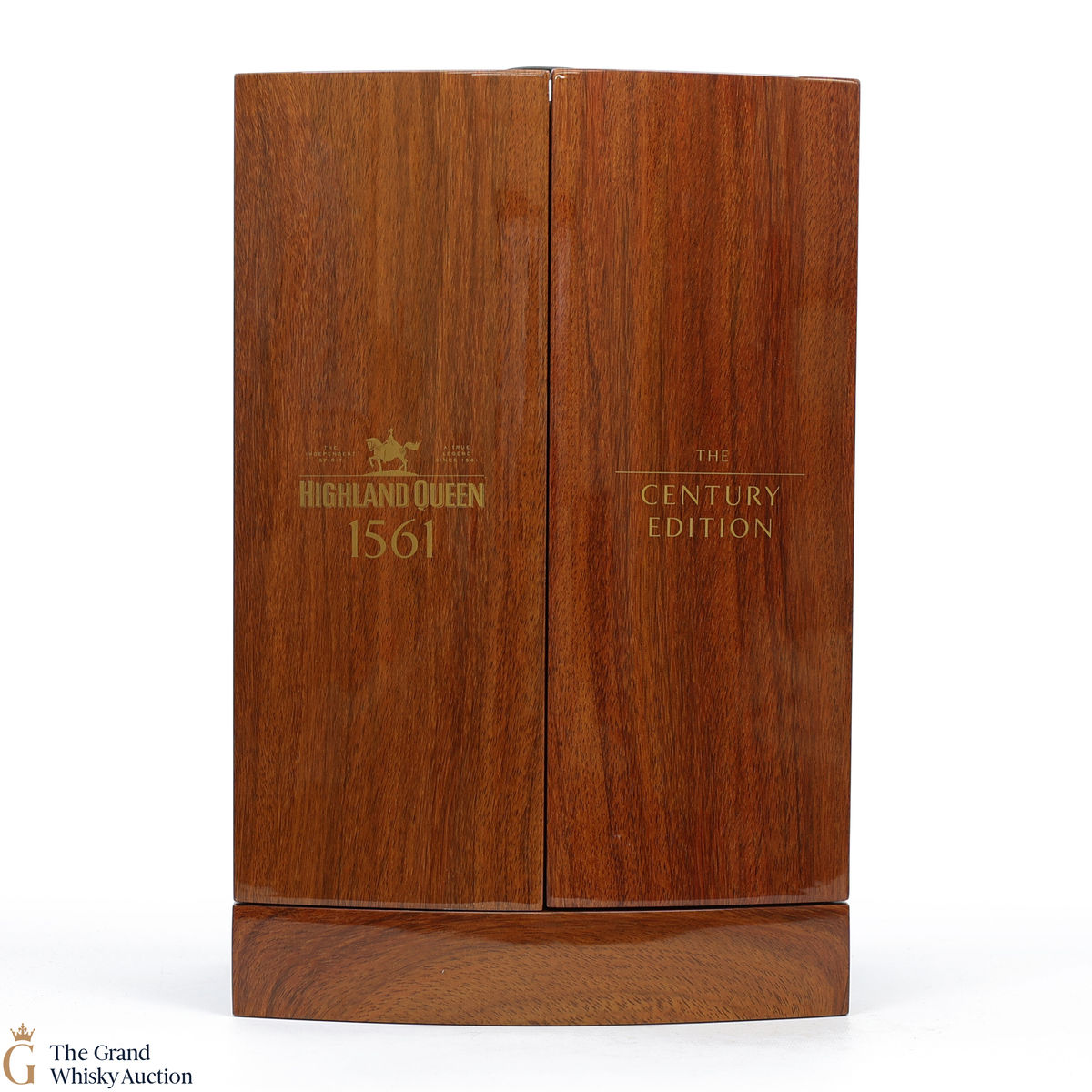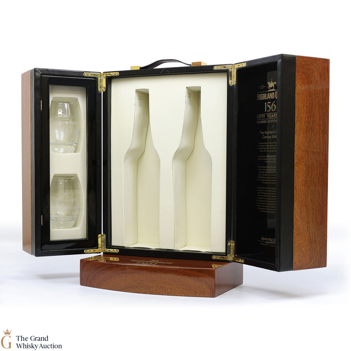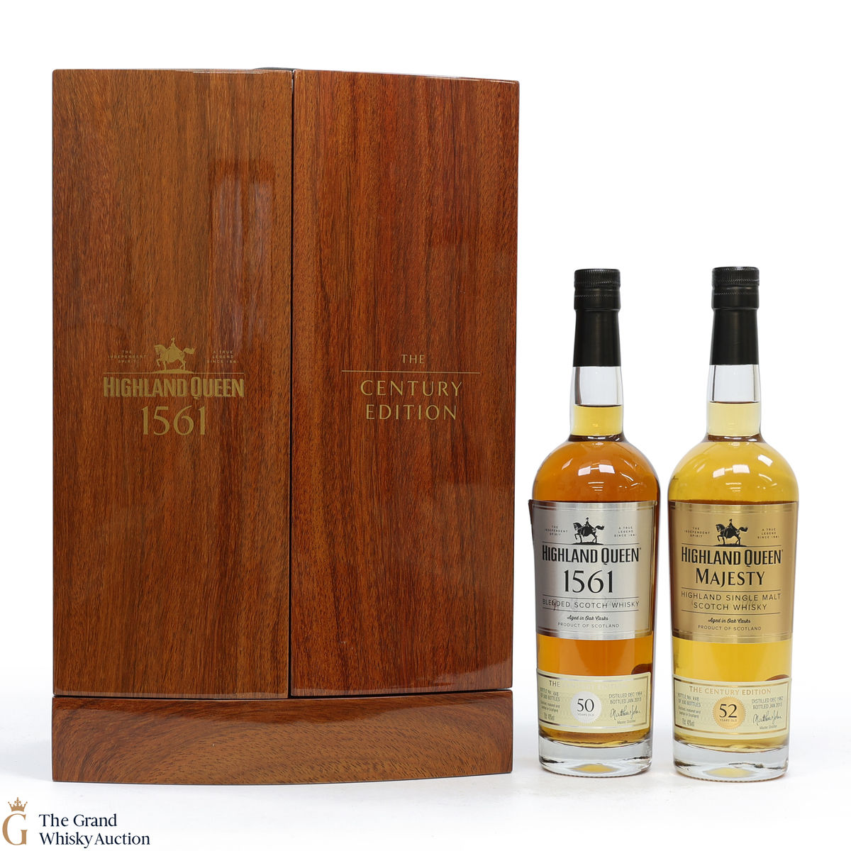 The Highland Queen Century Edition holds a bottle of the Highland Queen Majesty Limited Edition 52-Year-Old Highland Single Malt, and a bottle of the Highland Queen 1561 50-Year-Old blended Scotch Whisky.