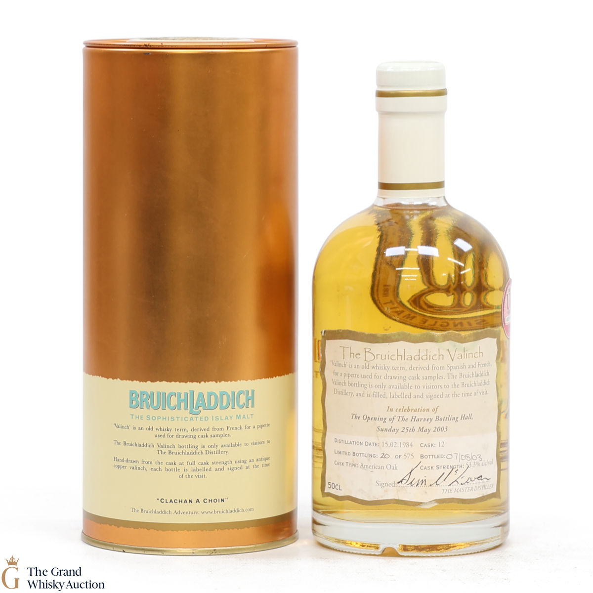 This bottling from Bruichladdich was distilled in 1984 and bottled from a single American Oak cask #12. It was originally only available at Bruichladdich Distillery, released in celebration of the opening of The Harvey Bottling Hall on Sunday 25h of May 2003. This is one of only 575 bottles. This is a 50cl bottling.