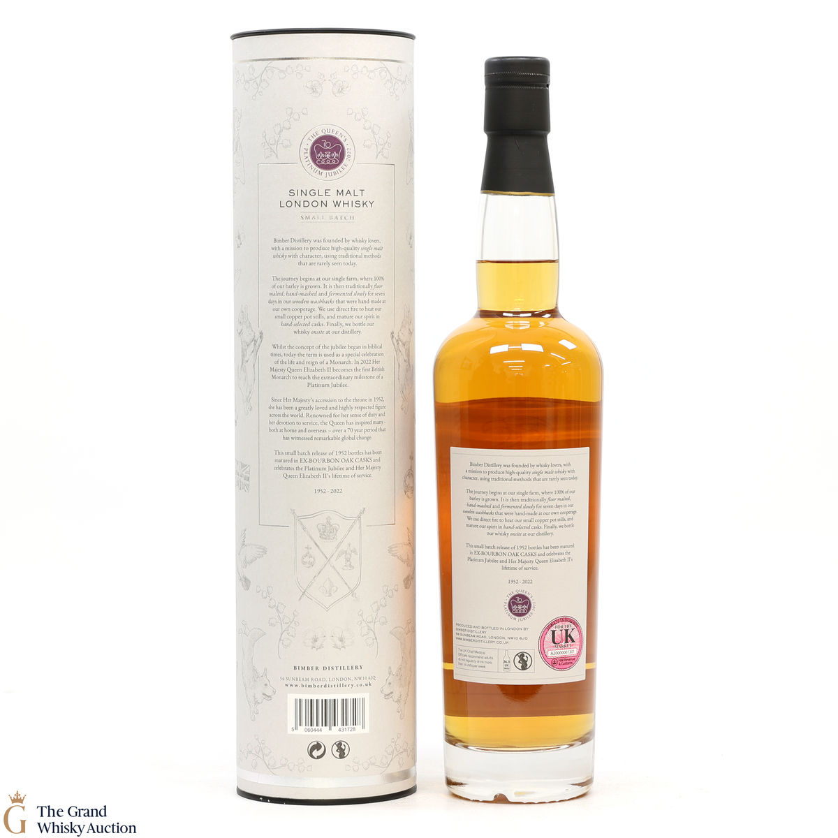 This Bimber limited edition small batch release celebrates the Platinum Jubilee of Queen Elizabeth II. Matured in ex-bourbon casks for four years before being bottled at a strength of 51.8% abv. One of 1,952 bottles.